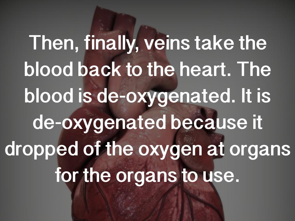Then, finally, veins take the blood back to the heart. The blood is de-oxygenated. It is de-oxygenated because it dropped of the oxygen at organs for the organs to use.