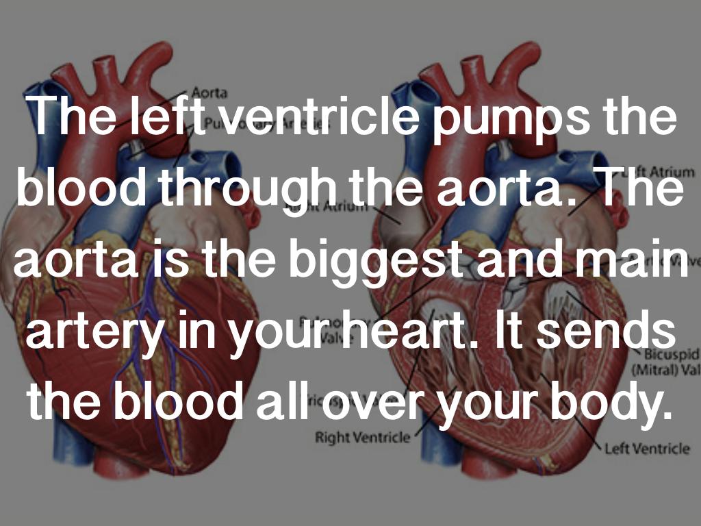 The left ventricle pumps the blood through the aorta. The aorta is the biggest and main artery in your heart. It sends the blood all over your body.