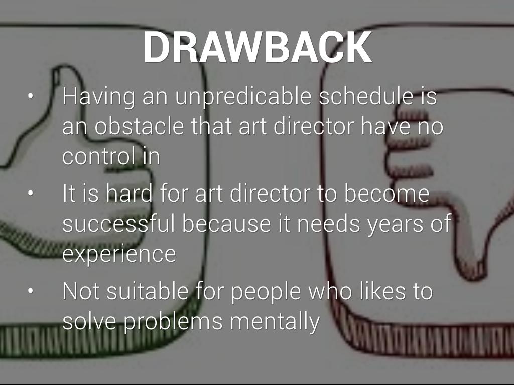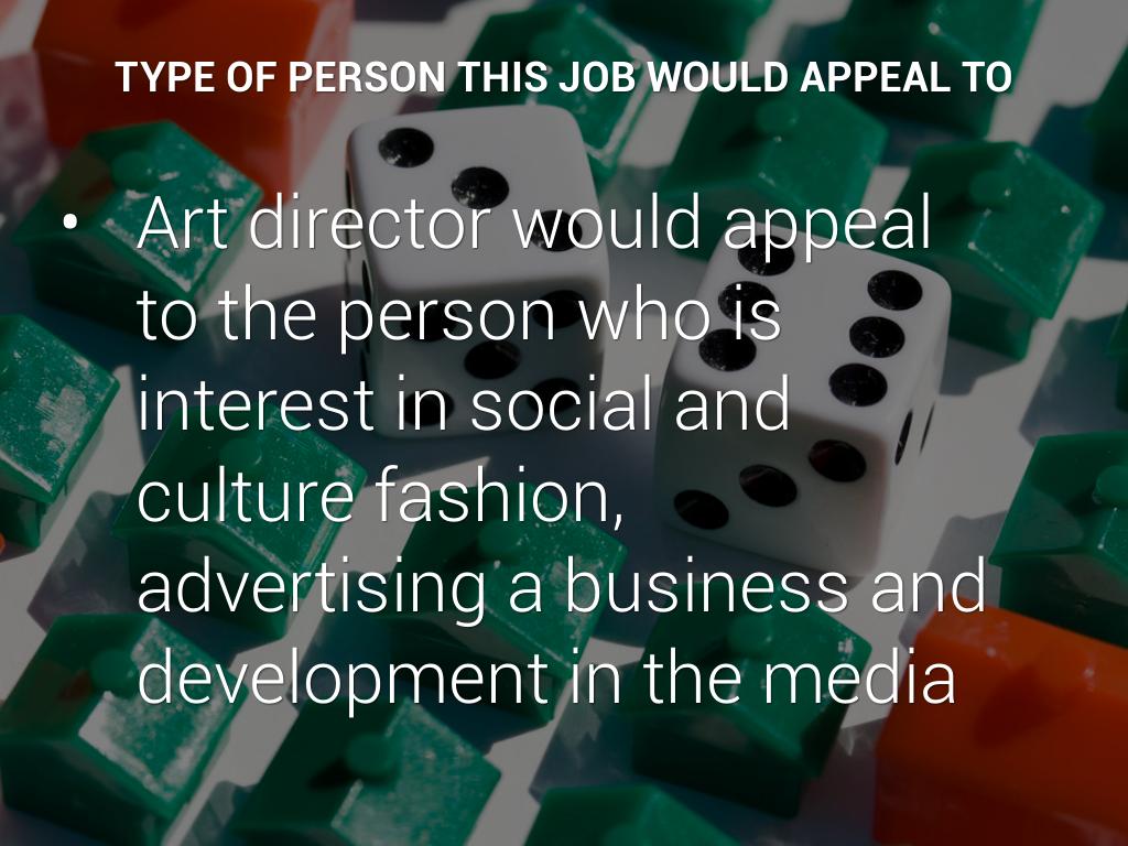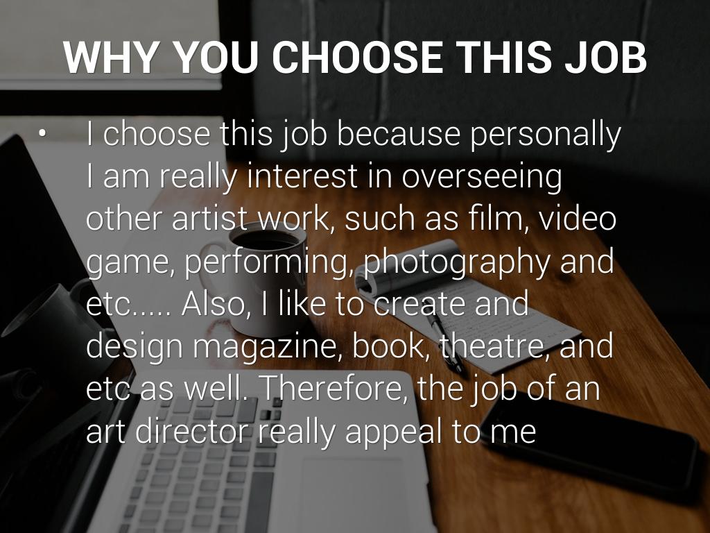 I choose this job because personally I am really interest in overseeing other artist work, such as film, video game, performing, photography and etc..... Also, I like to create and design magazine, book, theatre, and etc as well. Therefore, the job of an art director really appeal to me