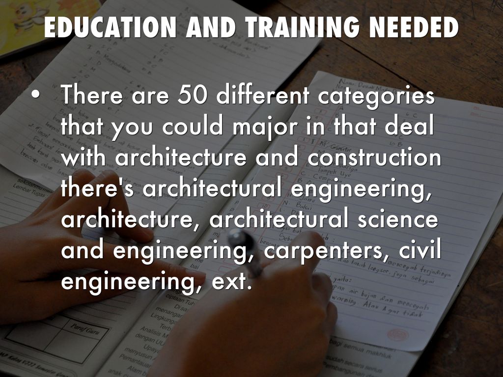 • There are 50 different categories that you could major in that deal with architecture and construction there's architectural engineering, architecture, architectural science and engineering, carpenters, civil engineering, ext.
