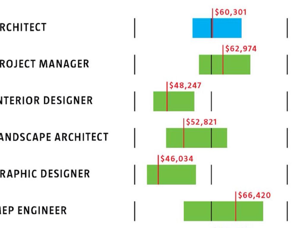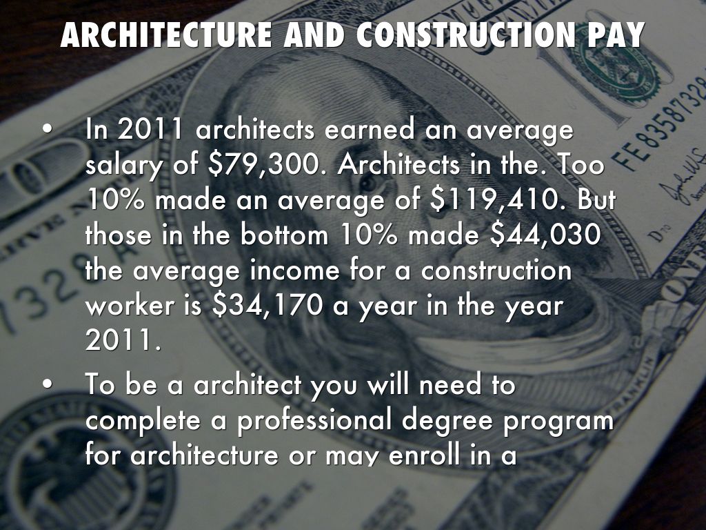 • In 2011 architects earned an average salary of $79,300. Architects in the. Too 10% made an average of $119,410. But those in the bottom 10% made $44,030 the average income for a construction worker is $34,170 a year in the year 2011.