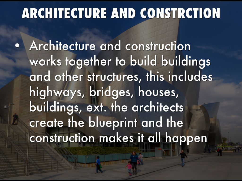 • Architecture and construction works together to build buildings and other structures, this includes highways, bridges, houses, buildings, ext. the architects create the blueprint and the construction makes it all happen