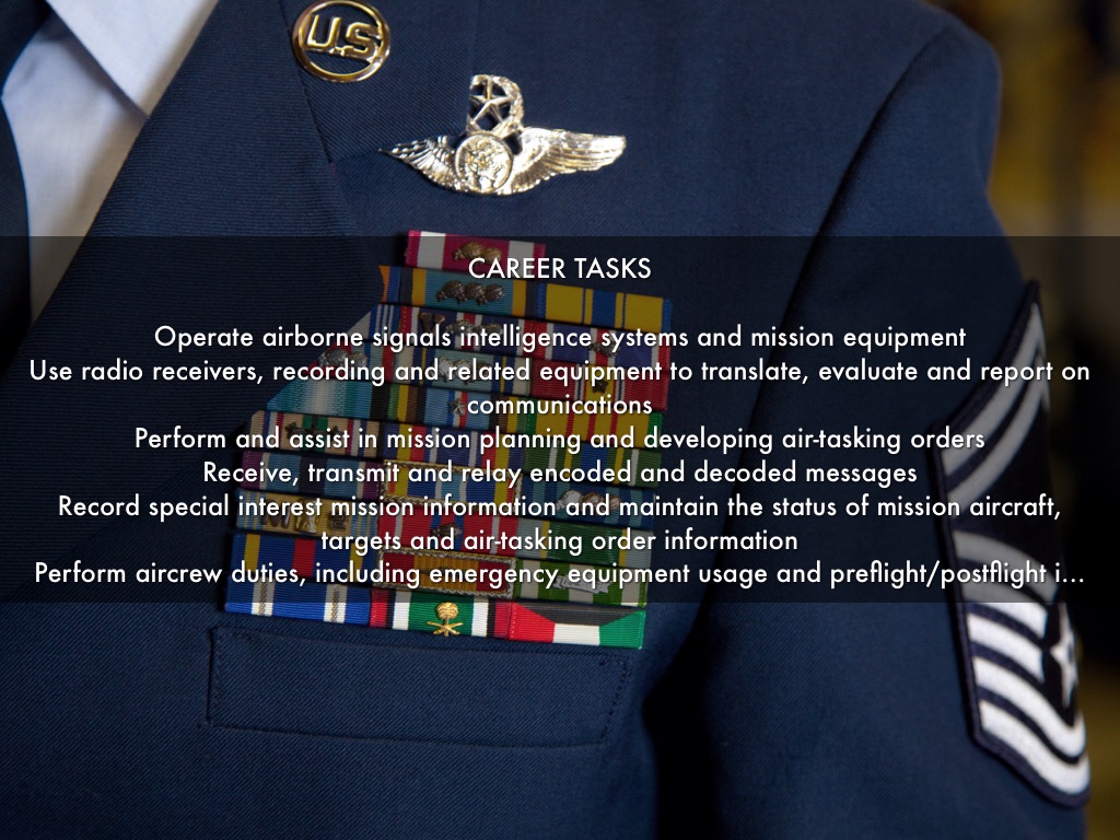 Operate airborne signals intelligence systems and mission equipment Use radio receivers, recording and related equipment to translate, evaluate and report on communications Perform and assist in mission planning and developing air-tasking orders Receive, transmit and relay encoded and decoded messages Record special interest mission information and maintain the status of mission aircraft, targets and air-tasking order information Perform aircrew duties, including emergency equipment usage and preflight/postflight inspections Maintain technical aids, logs and records