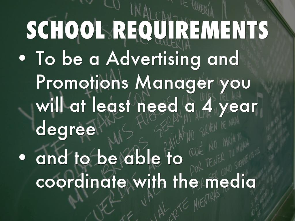• To be a Advertising and Promotions Manager you will at least need a 4 year degree