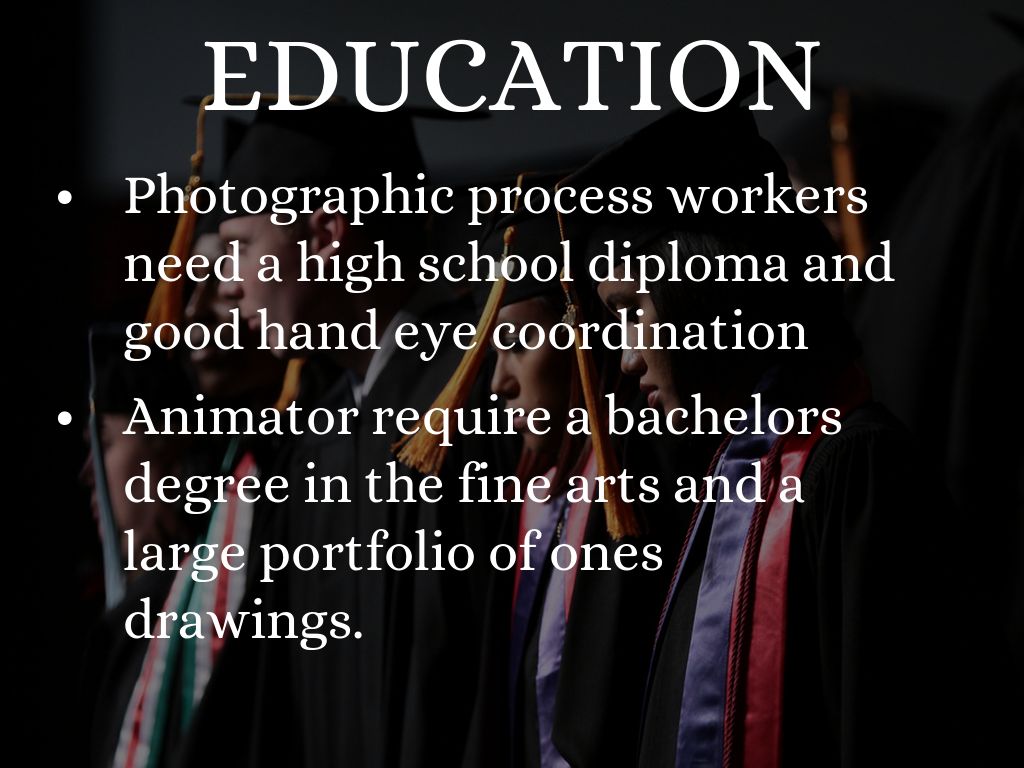 Animator require a bachelors degree in the fine arts and a large portfolio of ones drawings.