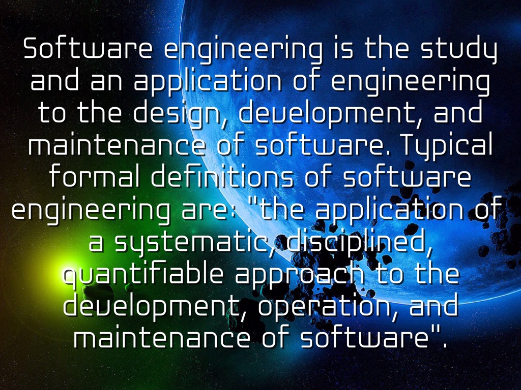 Software engineering is the study and an application of engineering to the design, development, and maintenance of software. Typical formal definitions of software engineering are: "the application of a systematic, disciplined, quantifiable approach to the development, operation, and maintenance of software".