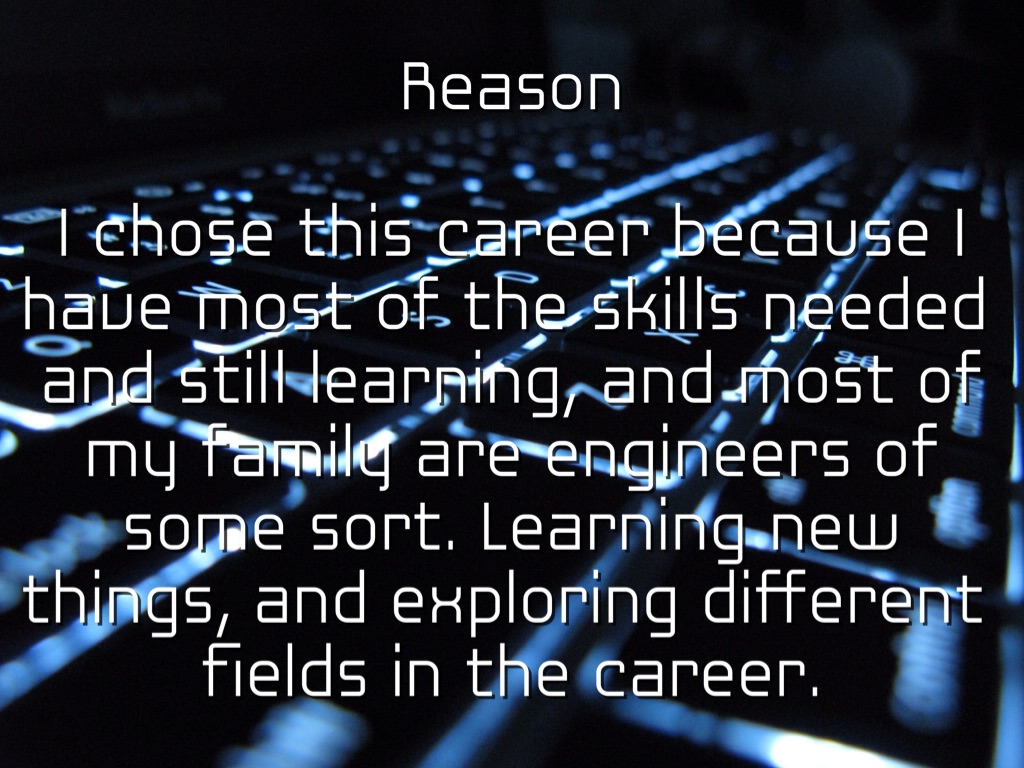 I chose this career because I have most of the skills needed and still learning, and most of my family are engineers of some sort. Learning new things, and exploring different fields in the career.
