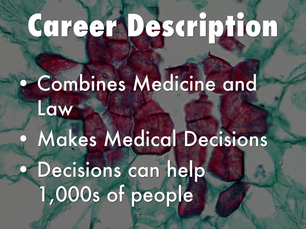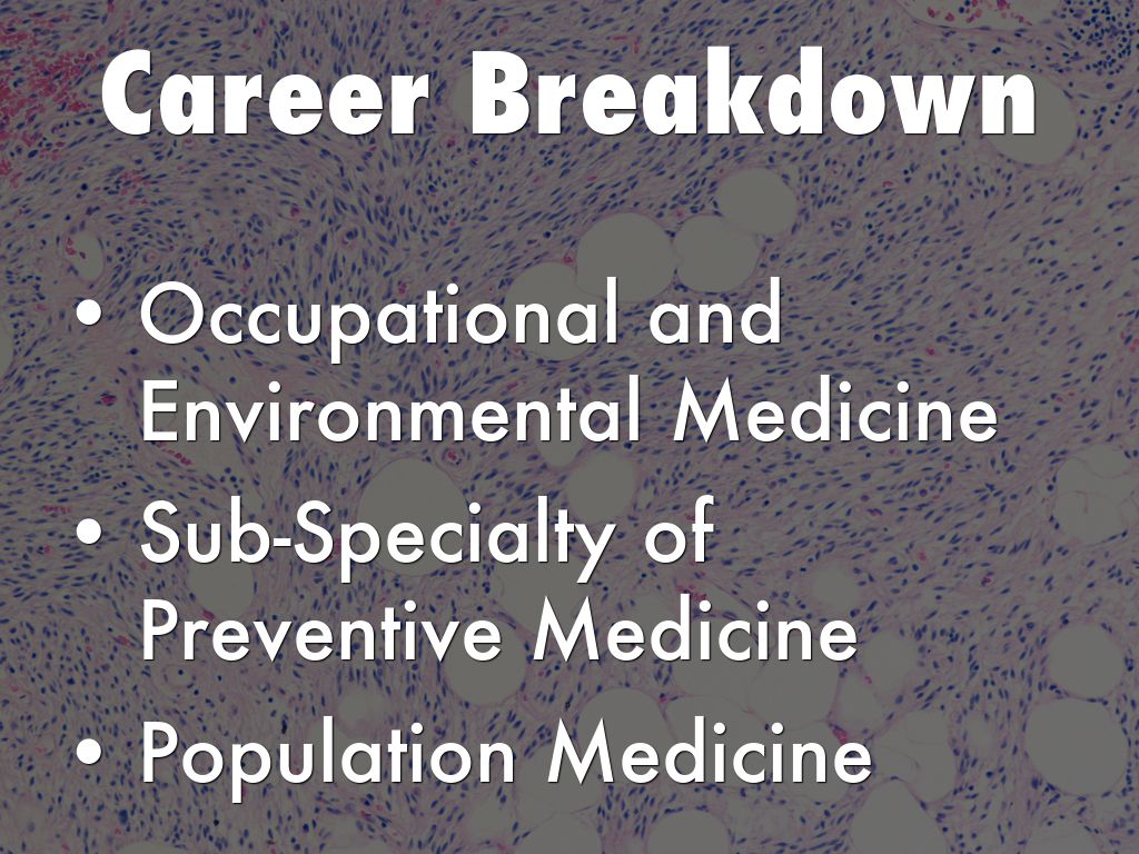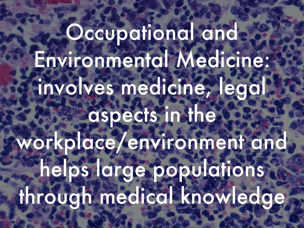 Occupational and Environmental Medicine: involves medicine, legal aspects in the workplace/environment and helps large populations through medical knowledge