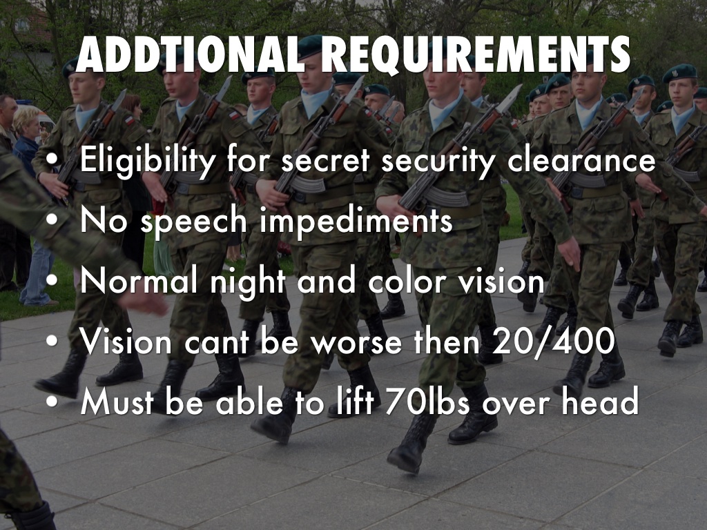 Be able to carry 65lb backpack 4 miles in under 1 hour