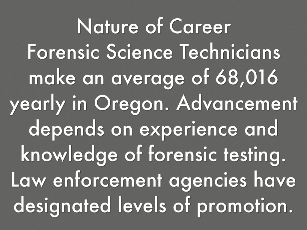 Forensic Science Technicians make an average of 68,016 yearly in Oregon. Advancement depends on experience and knowledge of forensic testing. Law enforcement agencies have designated levels of promotion.