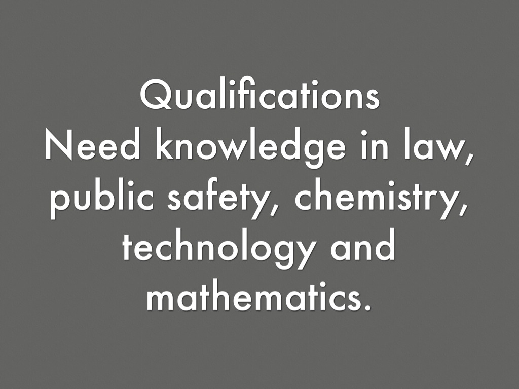 Need knowledge in law, public safety, chemistry, technology and mathematics.