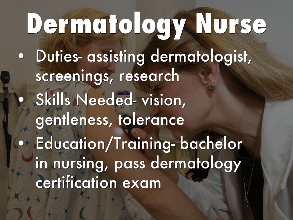 Education/Training- bachelor in nursing, pass dermatology certification exam