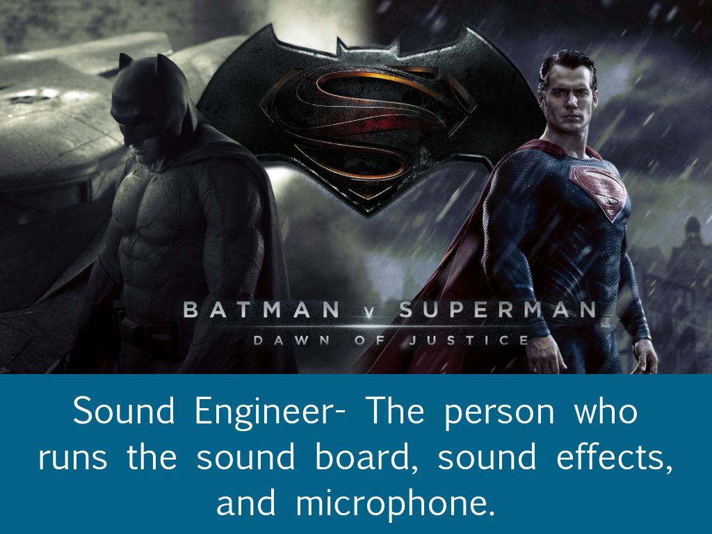 Sound Engineer- The person who runs the sound board, sound effects, and microphone.