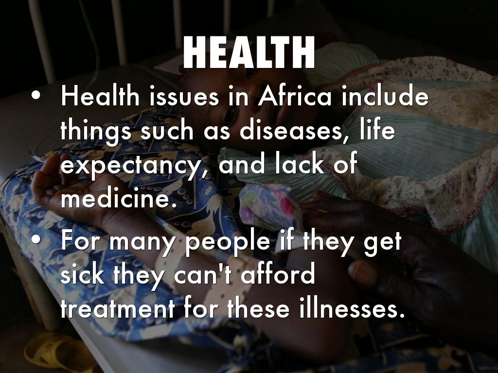 Health issues in Africa include things such as diseases, life expectancy, and lack of medicine.