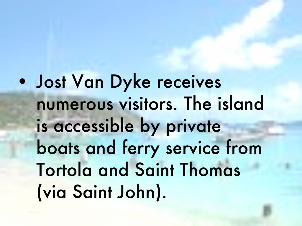 - Jost Van Dyke receives numerous visitors. The island is accessible by private boats and ferry service from Tortola and Saint Thomas (via Saint John).