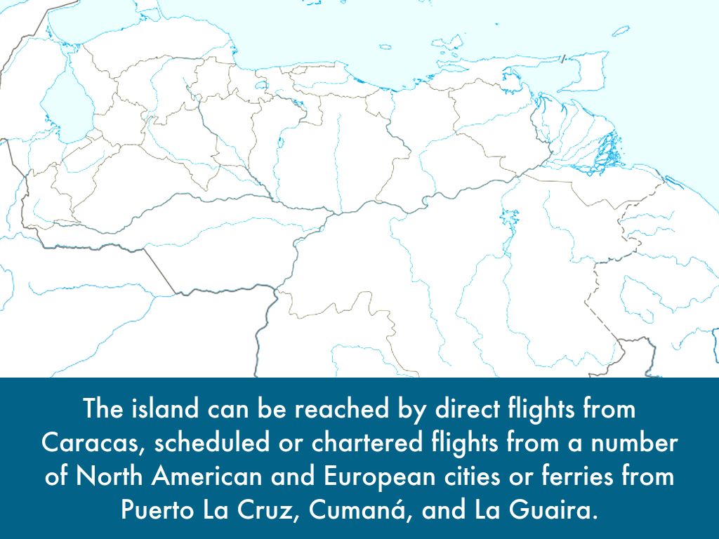 The island can be reached by direct flights from Caracas, scheduled or chartered flights from a number of North American and European cities or ferries from Puerto La Cruz, Cumaná, and La Guaira.
