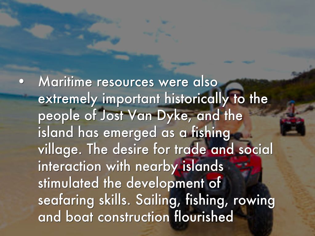 - Maritime resources were also extremely important historically to the people of Jost Van Dyke, and the island has emerged as a fishing village. The desire for trade and social interaction with nearby islands stimulated the development of seafaring skills. Sailing, fishing, rowing and boat construction flourished