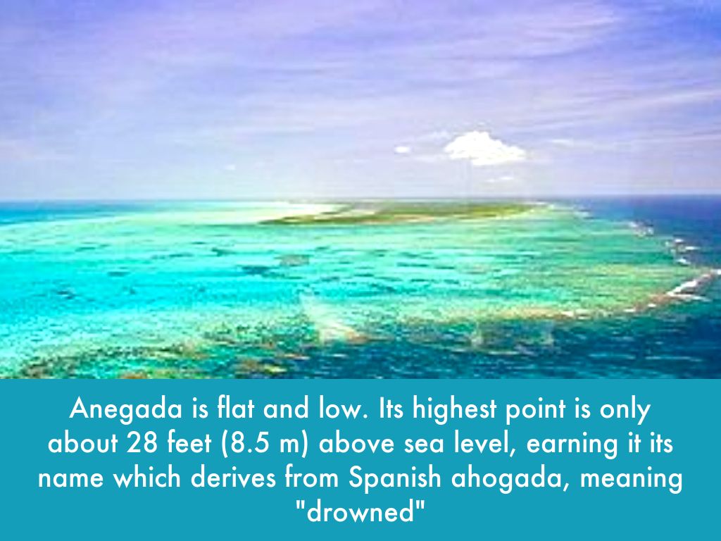 Anegada is flat and low. Its highest point is only about 28 feet (8.5 m) above sea level, earning it its name which derives from Spanish ahogada, meaning "drowned"