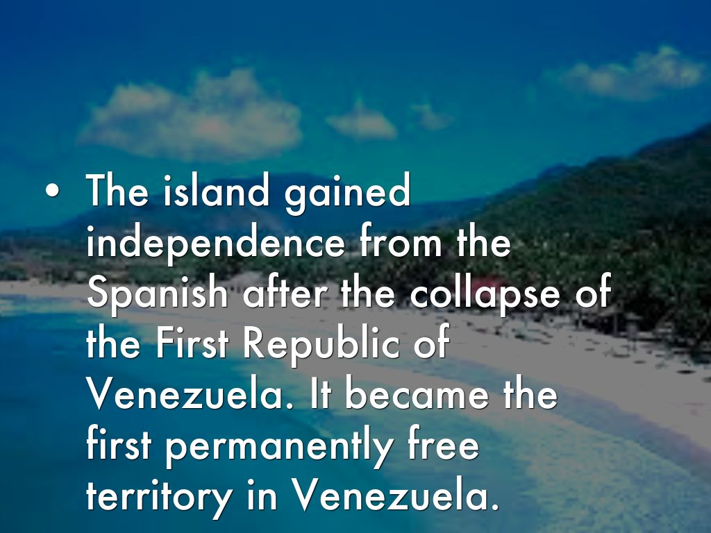 - The island gained independence from the Spanish after the collapse of the First Republic of Venezuela. It became the first permanently free territory in Venezuela.