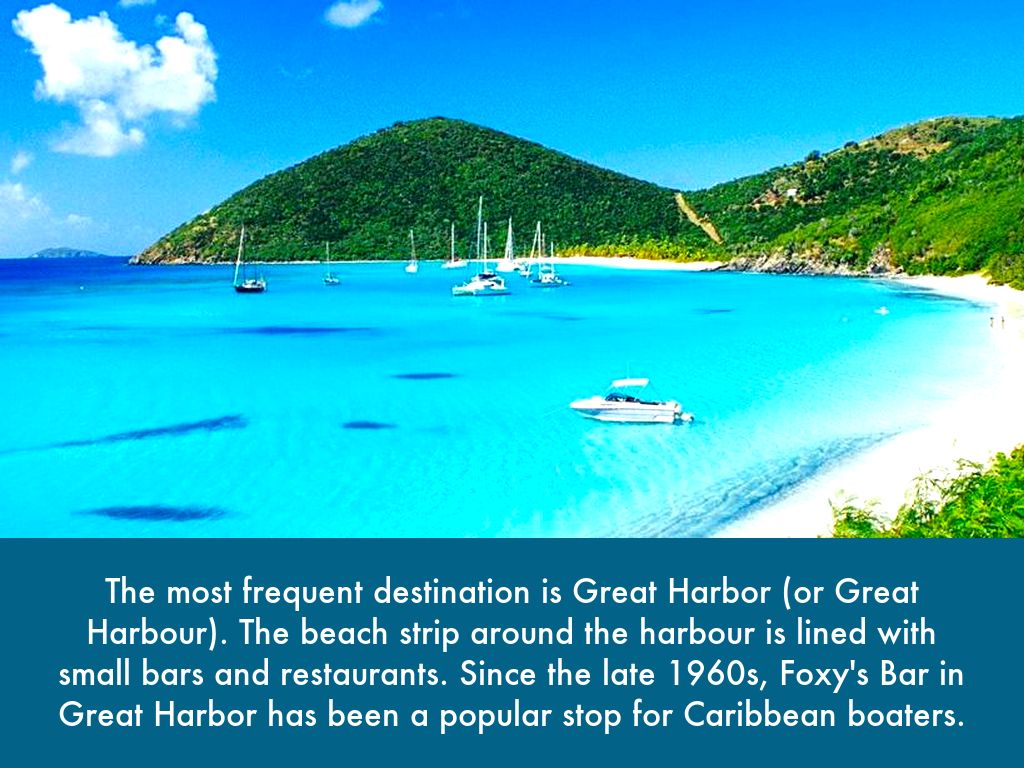 The most frequent destination is Great Harbor (or Great Harbour). The beach strip around the harbour is lined with small bars and restaurants. Since the late 1960s, Foxy's Bar in Great Harbor has been a popular stop for Caribbean boaters.