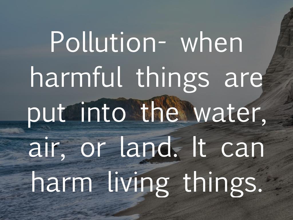 Pollution- when harmful things are put into the water, air, or land. It can harm living things.