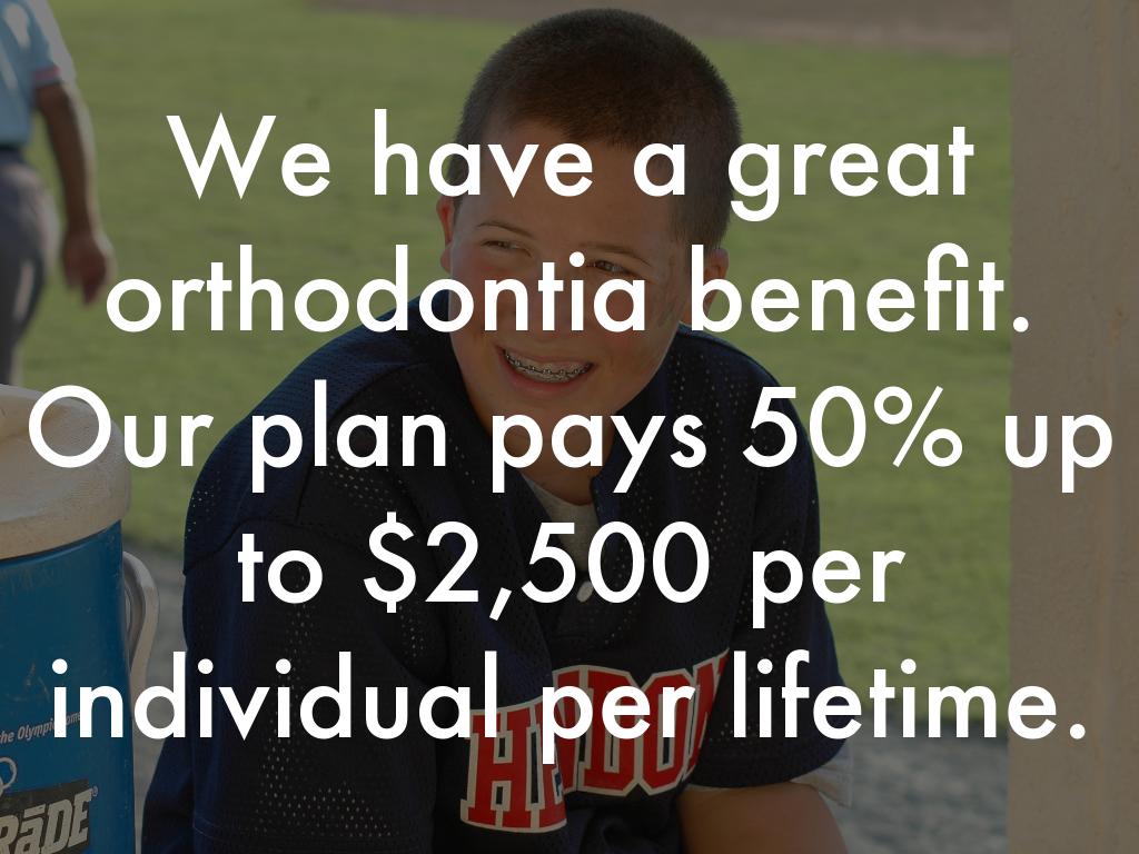 We have a great orthodontia benefit. Our plan pays 50% up to $2,500 per individual per lifetime.