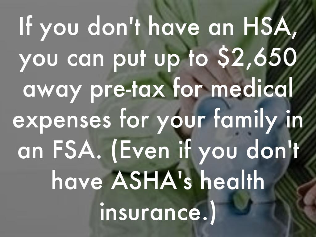If you don't have an HSA, you can put up to $2,650 away pre-tax for medical expenses for your family in an FSA. (Even if you don't have ASHA's health insurance.)