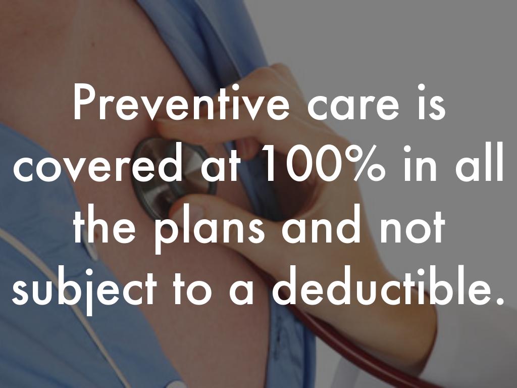Preventive care is covered at 100% in all the plans and not subject to a deductible.