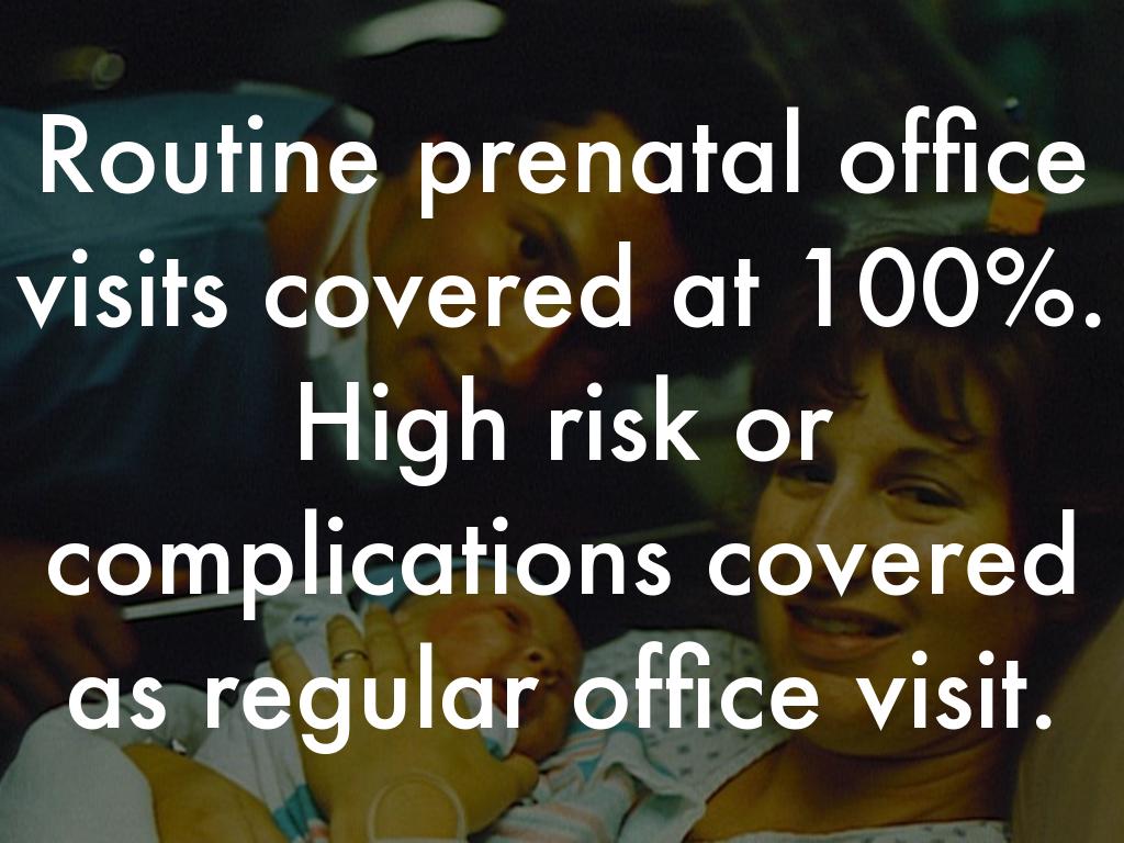 Routine prenatal office visits covered at 100%. High risk or complications covered as regular office visit.