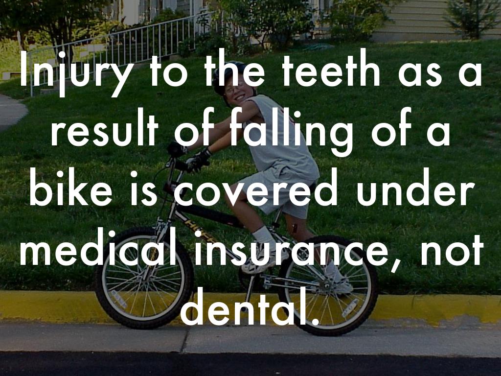 Injury to the teeth as a result of falling of a bike is covered under medical insurance, not dental.