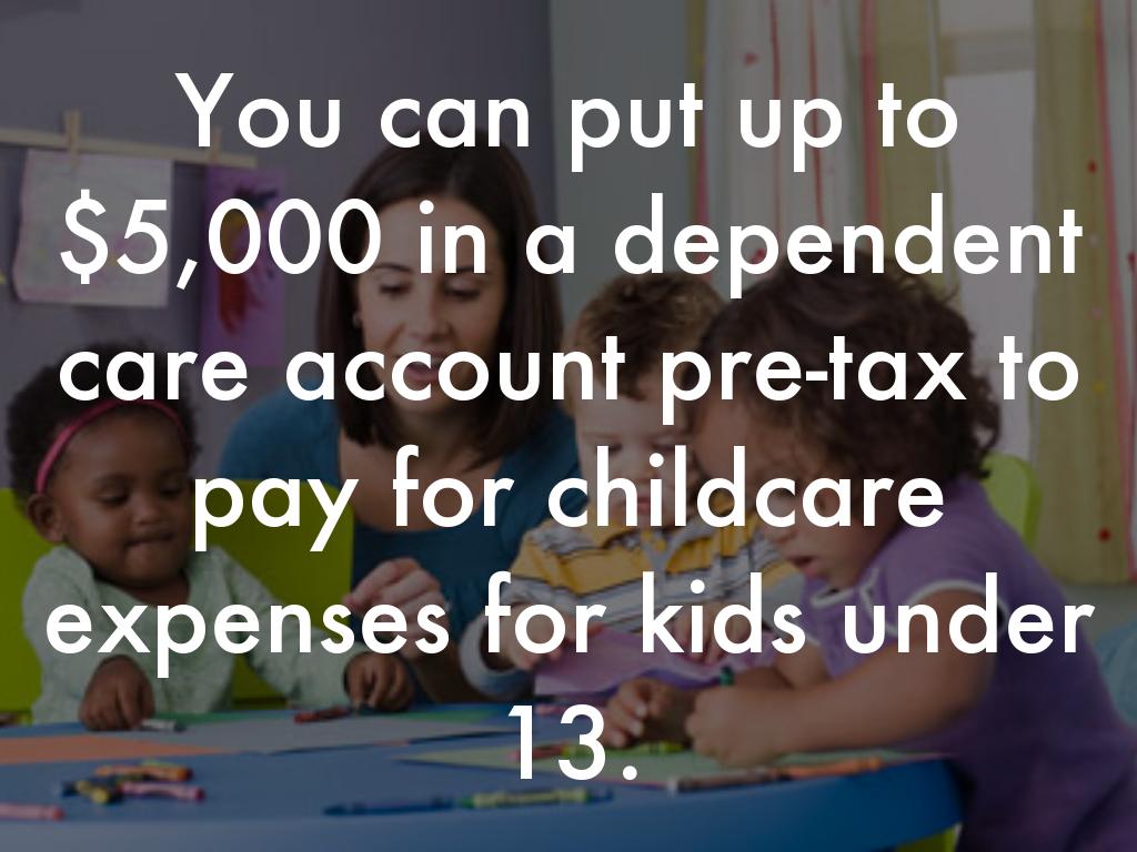 You can put up to $5,000 in a dependent care account pre-tax to pay for childcare expenses for kids under 13.