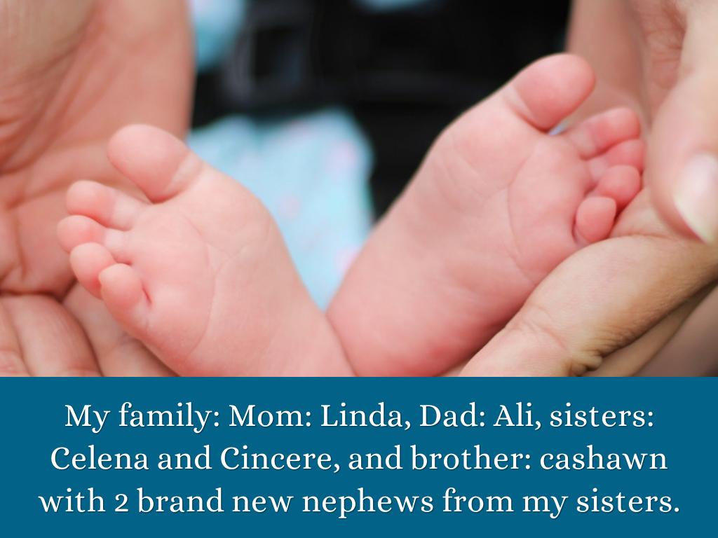 My family: Mom: Linda, Dad: Ali, sisters: Celena and Cincere, and brother: cashawn with 2 brand new nephews from my sisters.