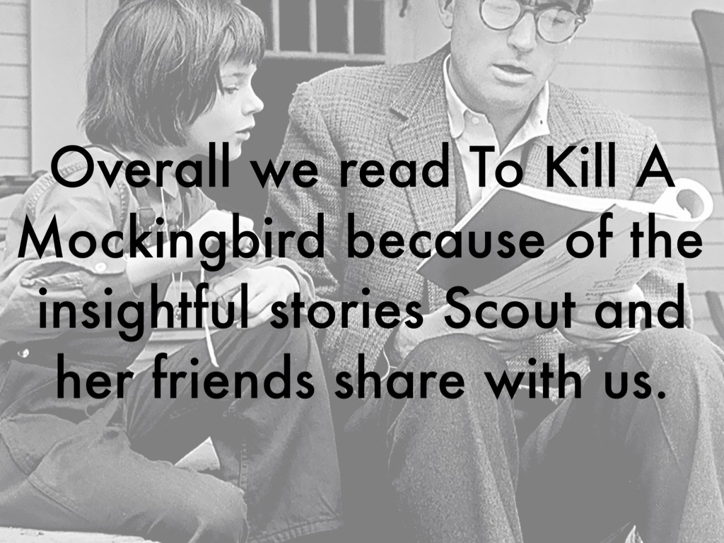 Overall we read To Kill A Mockingbird because of the insightful stories Scout and her friends share with us.