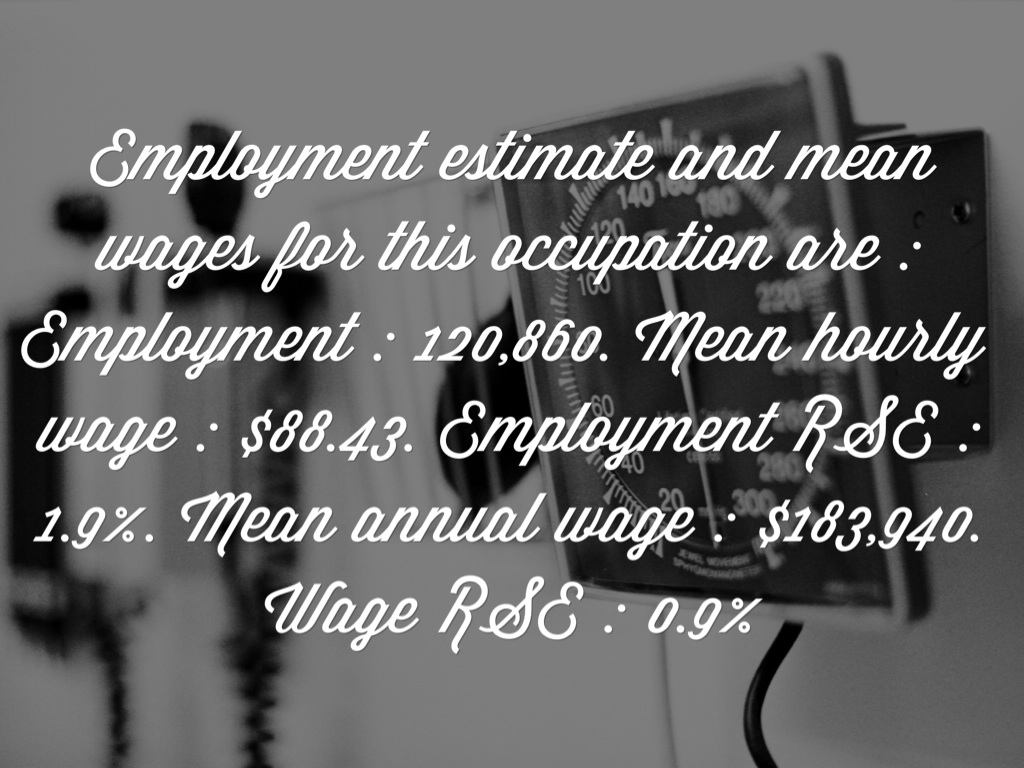 Employment estimate and mean wages for this occupation are : Employment : 120,860. Mean hourly wage : $88.43. Employment RSE : 1.9%. Mean annual wage : $183,940. Wage RSE : 0.9%