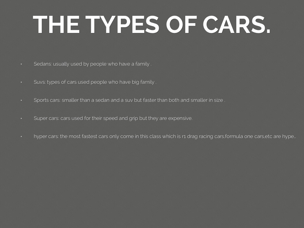 - hyper cars: the most fastest cars only come in this class which is r1 drag racing cars,formula one cars,etc are hyper cars.