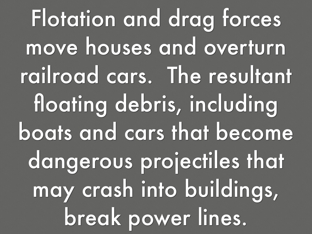 Flotation and drag forces move houses and overturn railroad cars. The resultant floating debris, including boats and cars that become dangerous projectiles that may crash into buildings, break power lines.