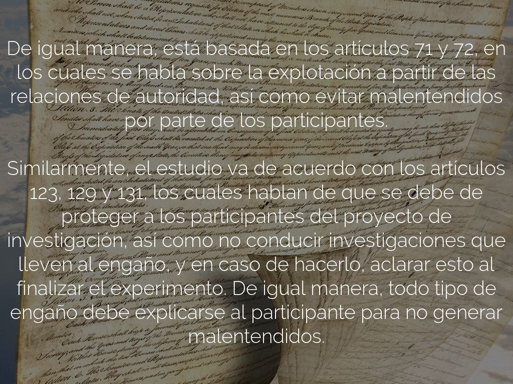 Similarmente, el estudio va de acuerdo con los artículos 123, 129 y 131, los cuales hablan de que se debe de proteger a los participantes del proyecto de investigación, así como no conducir investigaciones que lleven al engaño, y en caso de hacerlo, aclarar esto al finalizar el experimento. De igual manera, todo tipo de engaño debe explicarse al participante para no generar malentendidos.