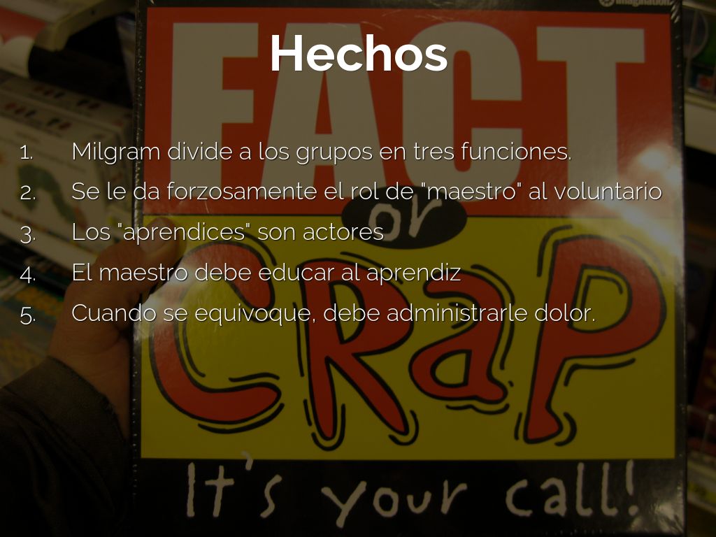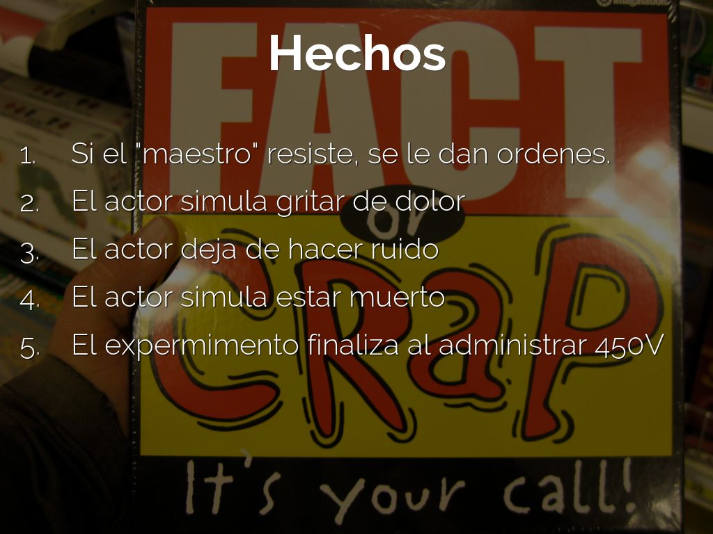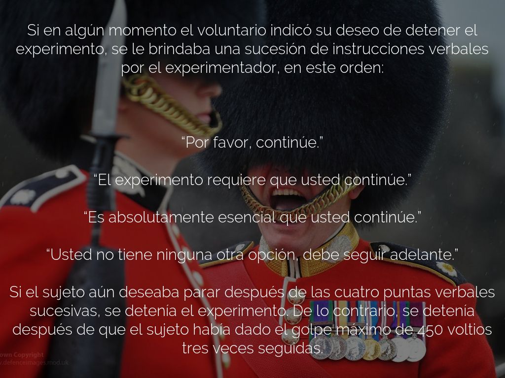 Si en algún momento el voluntario indicó su deseo de detener el experimento, se le brindaba una sucesión de instrucciones verbales por el experimentador, en este orden: