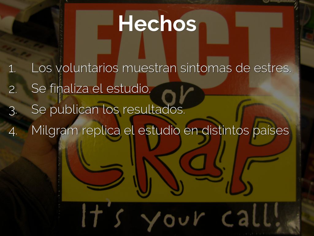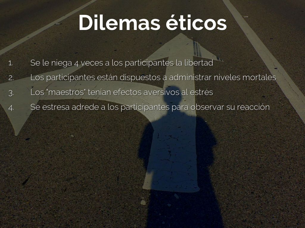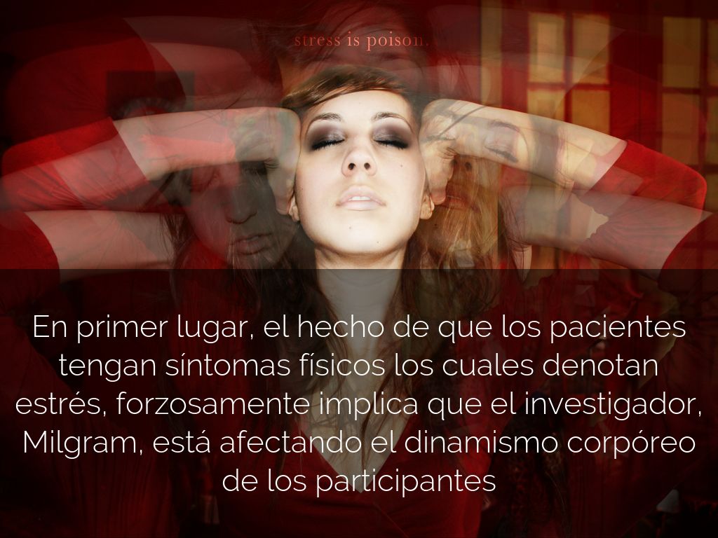 En primer lugar, el hecho de que los pacientes tengan síntomas físicos los cuales denotan estrés, forzosamente implica que el investigador, Milgram, está afectando el dinamismo corpóreo de los participantes