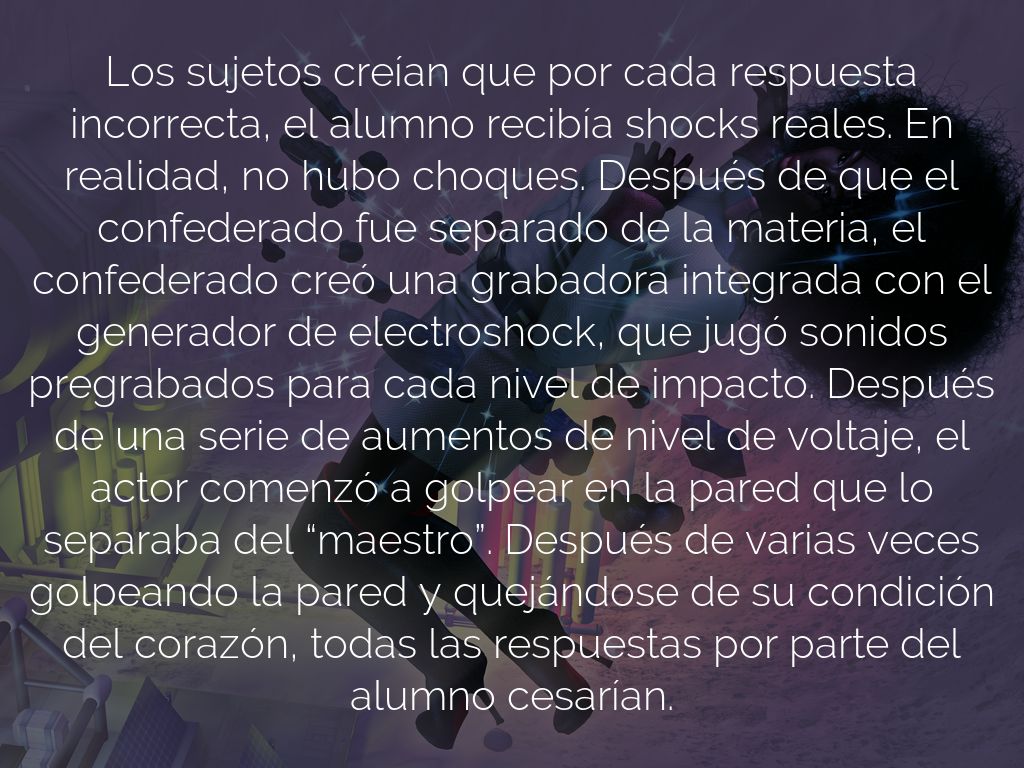 Los sujetos creían que por cada respuesta incorrecta, el alumno recibía shocks reales. En realidad, no hubo choques. Después de que el confederado fue separado de la materia, el confederado creó una grabadora integrada con el generador de electroshock, que jugó sonidos pregrabados para cada nivel de impacto. Después de una serie de aumentos de nivel de voltaje, el actor comenzó a golpear en la pared que lo separaba del “maestro”. Después de varias veces golpeando la pared y quejándose de su condición del corazón, todas las respuestas por parte del alumno cesarían.