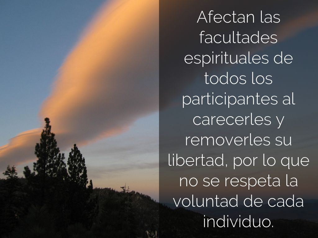 Afectan las facultades espirituales de todos los participantes al carecerles y removerles su libertad, por lo que no se respeta la voluntad de cada individuo.