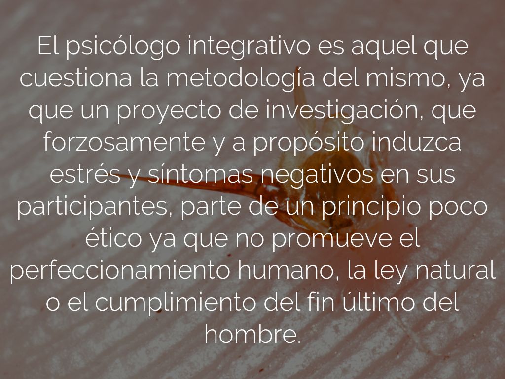 El psicólogo integrativo es aquel que cuestiona la metodología del mismo, ya que un proyecto de investigación, que forzosamente y a propósito induzca estrés y síntomas negativos en sus participantes, parte de un principio poco ético ya que no promueve el perfeccionamiento humano, la ley natural o el cumplimiento del fin último del hombre.