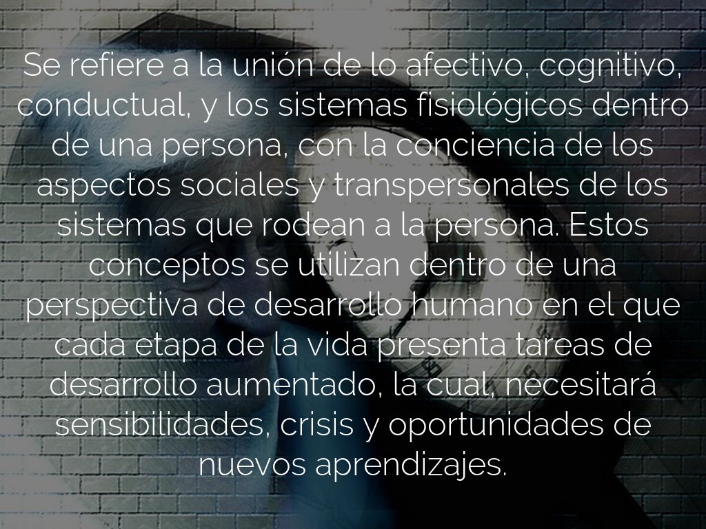 Se refiere a la unión de lo afectivo, cognitivo, conductual, y los sistemas fisiológicos dentro de una persona, con la conciencia de los aspectos sociales y transpersonales de los sistemas que rodean a la persona. Estos conceptos se utilizan dentro de una perspectiva de desarrollo humano en el que cada etapa de la vida presenta tareas de desarrollo aumentado, la cual, necesitará sensibilidades, crisis y oportunidades de nuevos aprendizajes.