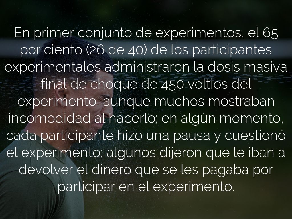 En primer conjunto de experimentos, el 65 por ciento (26 de 40) de los participantes experimentales administraron la dosis masiva final de choque de 450 voltios del experimento, aunque muchos mostraban incomodidad al hacerlo; en algún momento, cada participante hizo una pausa y cuestionó el experimento; algunos dijeron que le iban a devolver el dinero que se les pagaba por participar en el experimento.