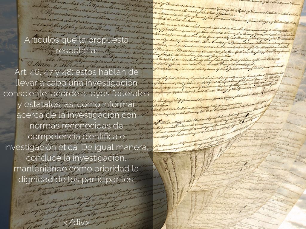 Art. 46, 47 y 48: estos hablan de llevar a cabo una investigación consciente, acorde a leyes federales y estatales, así como informar acerca de la investigación con normas reconocidas de competencia científica e investigación ética. De igual manera, conduce la investigación, manteniendo como prioridad la dignidad de los participantes.