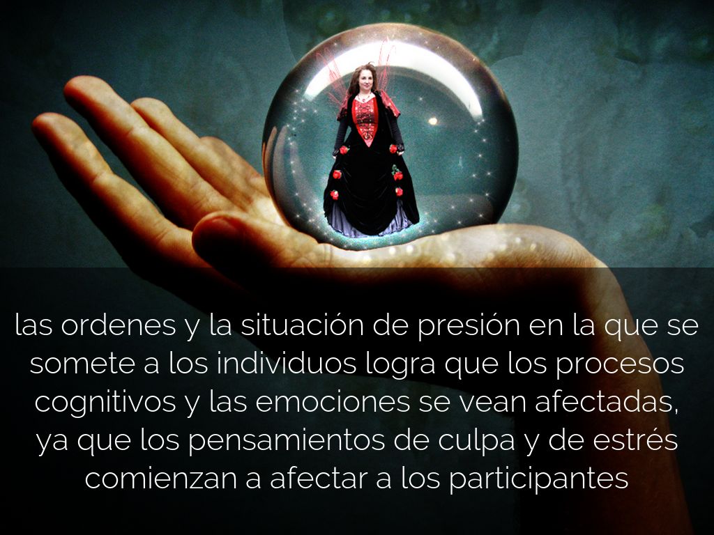 las ordenes y la situación de presión en la que se somete a los individuos logra que los procesos cognitivos y las emociones se vean afectadas, ya que los pensamientos de culpa y de estrés comienzan a afectar a los participantes