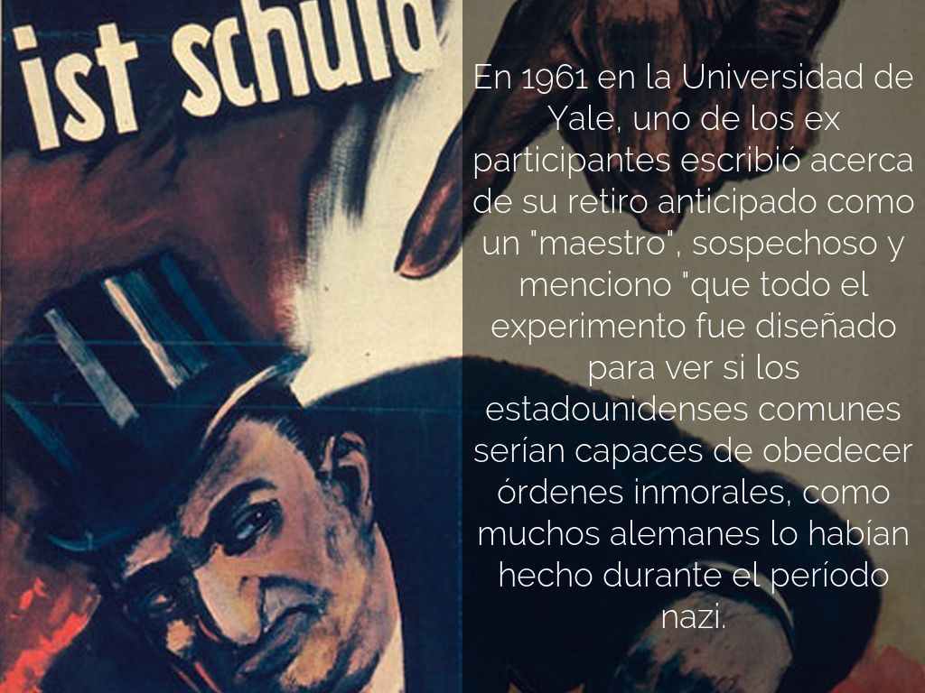 En 1961 en la Universidad de Yale, uno de los ex participantes escribió acerca de su retiro anticipado como un "maestro", sospechoso y menciono "que todo el experimento fue diseñado para ver si los estadounidenses comunes serían capaces de obedecer órdenes inmorales, como muchos alemanes lo habían hecho durante el período nazi.