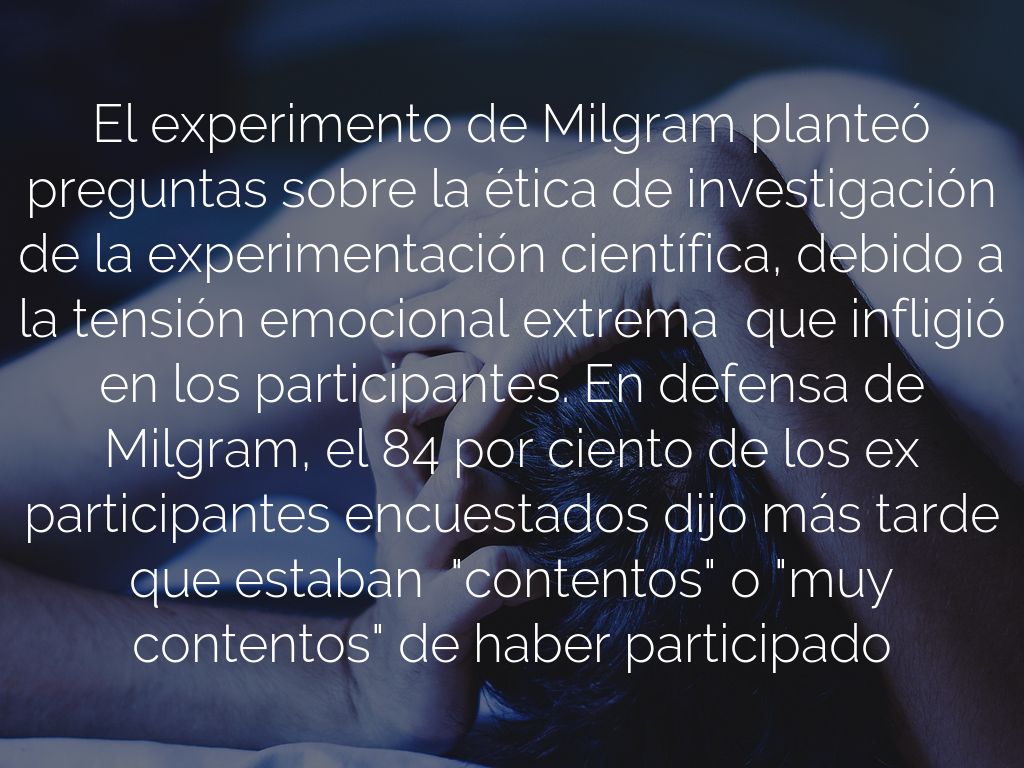 El experimento de Milgram planteó preguntas sobre la ética de investigación de la experimentación científica, debido a la tensión emocional extrema que infligió en los participantes. En defensa de Milgram, el 84 por ciento de los ex participantes encuestados dijo más tarde que estaban "contentos" o "muy contentos" de haber participado
