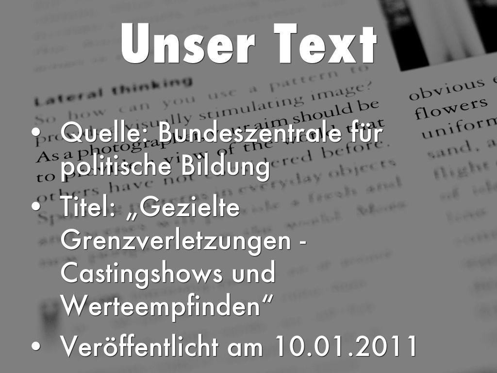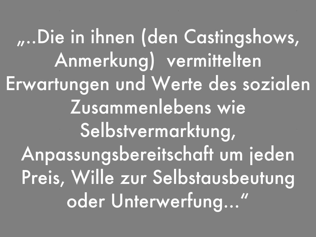 „..Die in ihnen (den Castingshows, Anmerkung) vermittelten Erwartungen und Werte des sozialen Zusammenlebens wie Selbstvermarktung, Anpassungsbereitschaft um jeden Preis, Wille zur Selbstausbeutung oder Unterwerfung...“