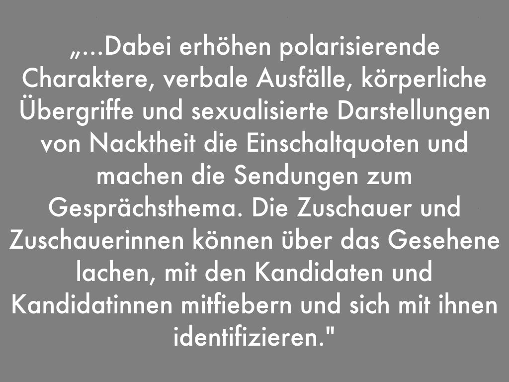„...Dabei erhöhen polarisierende Charaktere, verbale Ausfälle, körperliche Übergriffe und sexualisierte Darstellungen von Nacktheit die Einschaltquoten und machen die Sendungen zum Gesprächsthema. Die Zuschauer und Zuschauerinnen können über das Gesehene lachen, mit den Kandidaten und Kandidatinnen mitfiebern und sich mit ihnen identifizieren."